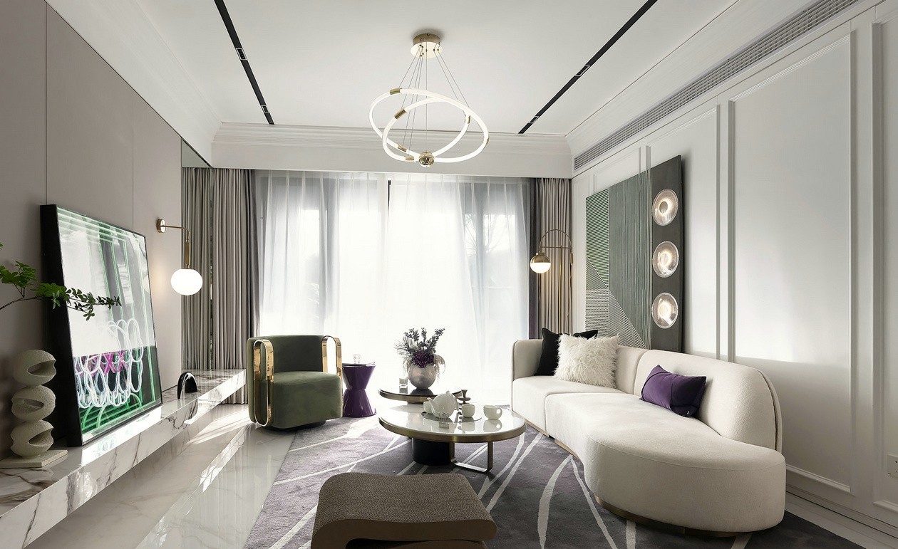 色彩是这场演奏曲中最独特的音符。薄藤紫代表着迷失在莫奈花园的浪漫,印象派迷恋她惬意的温度,居住者爱上她的优雅与深情。设计师通过独具记忆点的色彩构成,将调色板点缀牛油果绿和薄藤紫调,让居室充满清新的氧化感,在精准把握浪漫、优雅、精致的法式精髓基础上,进行现代化手法的全新演绎。