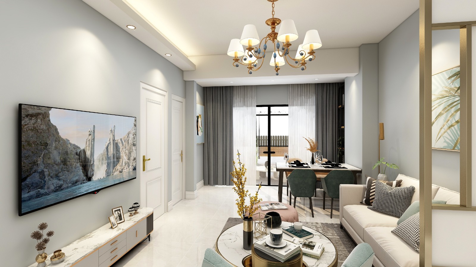 浅灰色的乳胶墙漆与白色地砖,展现时尚简约。简单的浅灰乳胶漆做为背景墙搭配轻奢圆角电视柜,简单耐看的小轻奢。