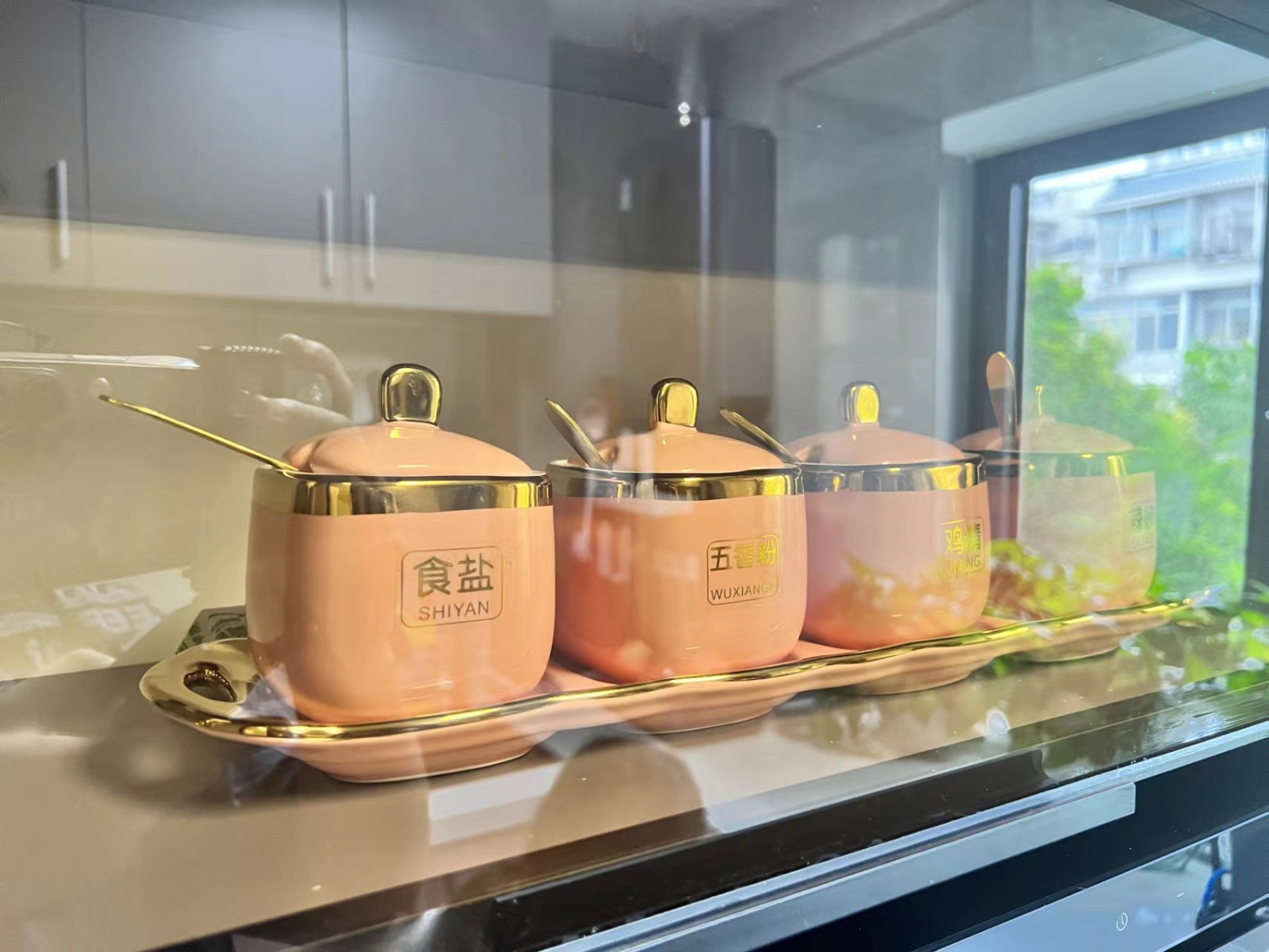 精巧的调料罐,透明的玻璃柜门,点缀出空间简约的气息。