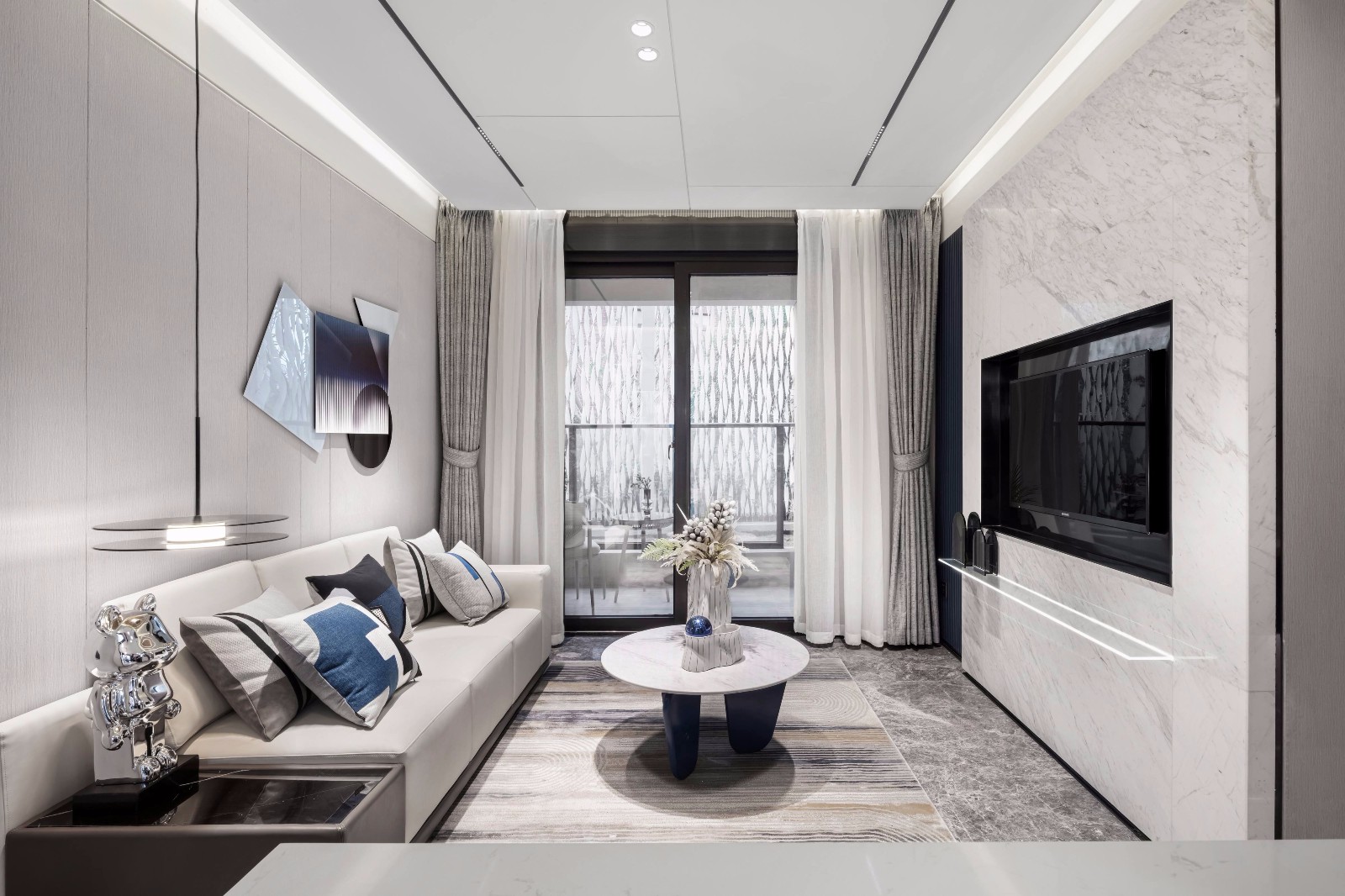 充满活力的蔚蓝成为整个空间的主题色调,让居室充满年轻语言。空间墙面以大块面组成,体块感与线条感使立面更加具有现代感