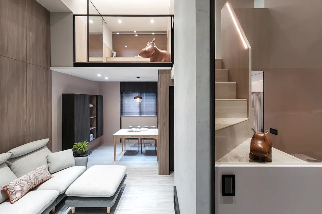 轻洒满地温煦柔润,衬上木皮、染上灰阶石纹,抹上一串孩儿银铃般的笑声,将此情此景收进章节里,缓缓叙说一个关于家的未完待续。设计团队以柔软笔触,布划出复层楼中楼架构,以楼梯串起工作与家庭生活的平衡点。