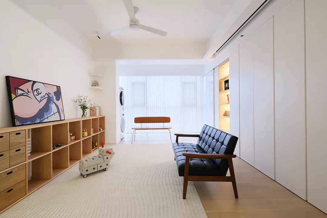 改造后是围合型的客厅,原木组合柜子可以收纳宝宝的日常玩具。沙背后的哑光奶白色的一门到顶,大大的弱化了柜子的存在感,还巨能装。