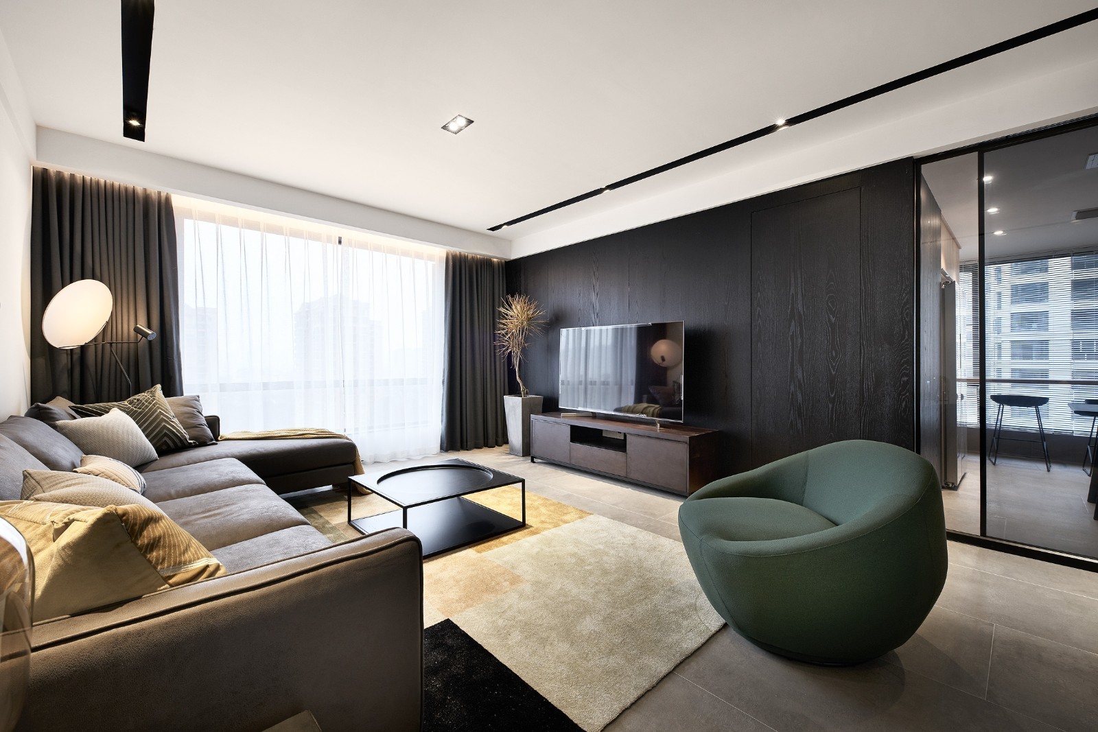 客厅贯穿东西,黑白配色简洁不失质感。 储藏间房门隐在柜体中,干净不拖泥带水。 细窄的黑色线条增强空间的立体感,点缀的亮色冲淡了冰冷。