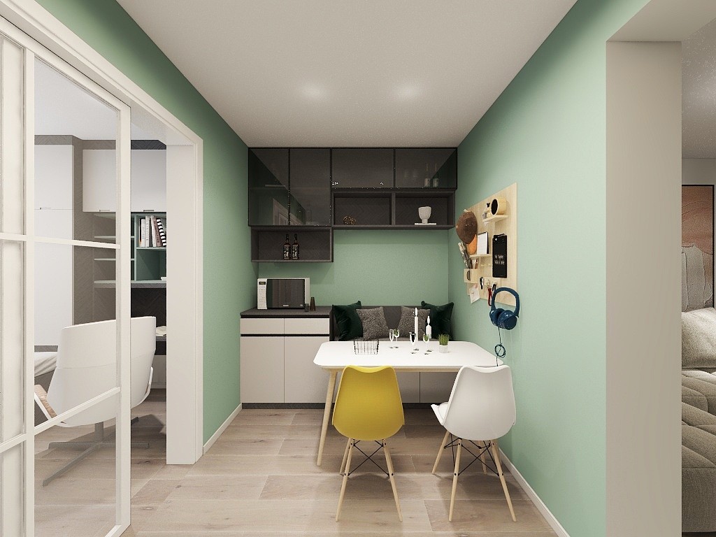 餐厅墙面延续门厅背景,既有视线的延续,又有空间的呼应, 卡座也是很好的利用空间