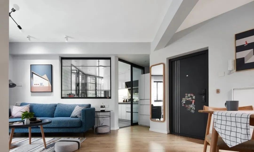 入户就是不规则的三角地带,左边是倚墙设立的白色鞋柜和全身镜组成玄关,右边是简约又实用的餐厅,卡座让小小的餐厅变得宽敞,整齐有秩序,配套的顶柜增加储物空间。