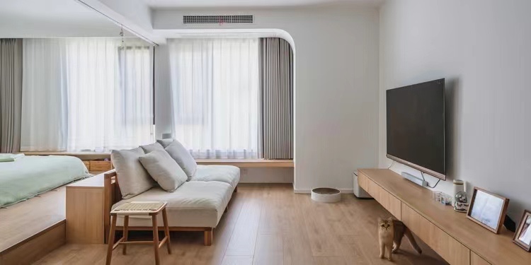 这是一对年轻的小夫妻居住,他们有着自己的生活态度和需求。打通了主卧和客厅的隔墙,拓展了空间,根据小夫妻的需求,进行了主卧和客厅一体化的设计。