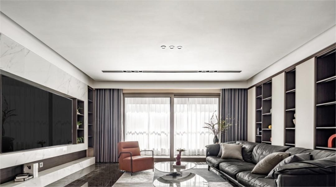 沉着克制的材质与色彩, 在皮质,木质、岩板等多种材质的叠加下, 不成为抢眼的视觉焦点, 但却能与各个空间通过材质来传递流动性。