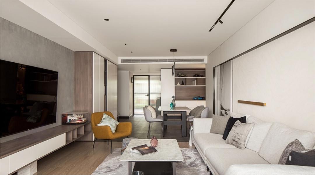 客厅在重新规划布置之后进行了一个活动和功能性的划分,将沙发餐桌一字横向靠左侧布置,将活动区域的重心偏向一侧,右侧整体做一组造型柜来进行分类收纳以及展示,同时也化解了原本狭长的客厅和墙体,考虑到客厅是家人常会客聊天的地方,所以地面改成了地板会更舒适,与门厅餐厅石材地面做了一个区域划分。