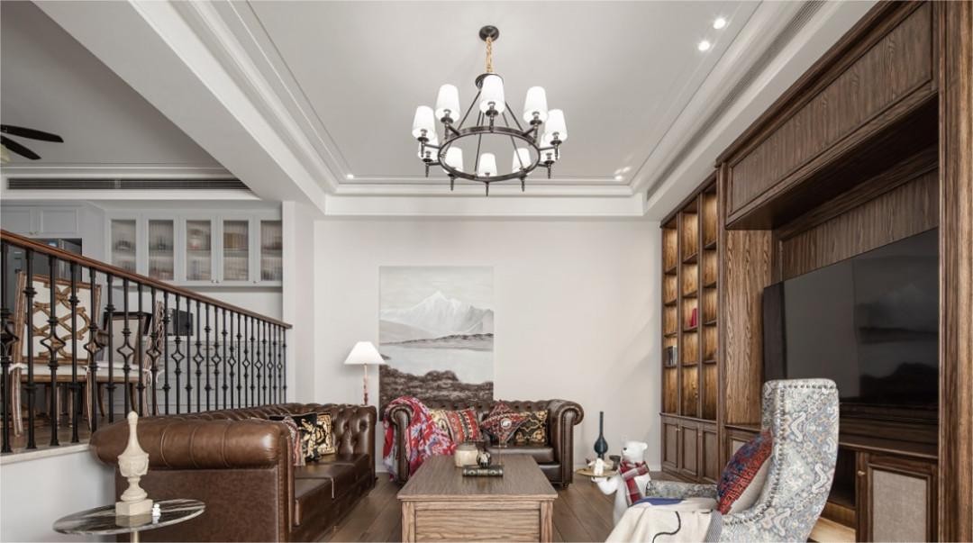 在家具和物品的陈列上,设计师摒弃多余的装饰,强化空间的艺术境界,通过紧密精巧的布局升华空间艺术美感。造型简约的石膏线吊顶走边、半围合式沙发布局,皆在强调着美式客厅所特有的温馨和随意感。