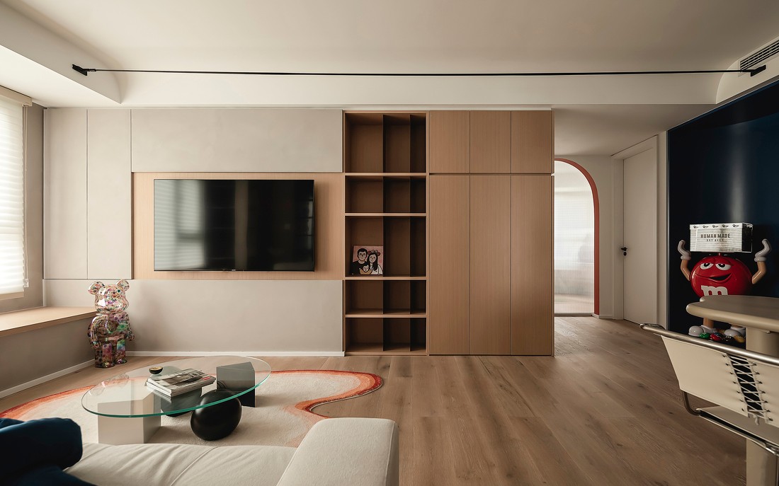 客厅利用了一些飘窗的位置,电视背景墙往内移了35公分,形成一个凹字形的结构,左边做了隐形收纳柜,右侧做了开放格和整面储物柜,同时也增大了主卫的空间。