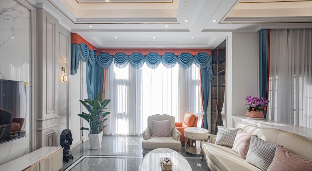 客厅以灰色瓷砖做地面设计,利用花杂色的瓷砖让空间更加的通透,浅香槟金色皮质搭配搭配椭圆形大理石茶几,精致又时尚。一侧大大的阳台搭配蓝色与玫红色窗帘,让整个空间都变得亮眼起来。