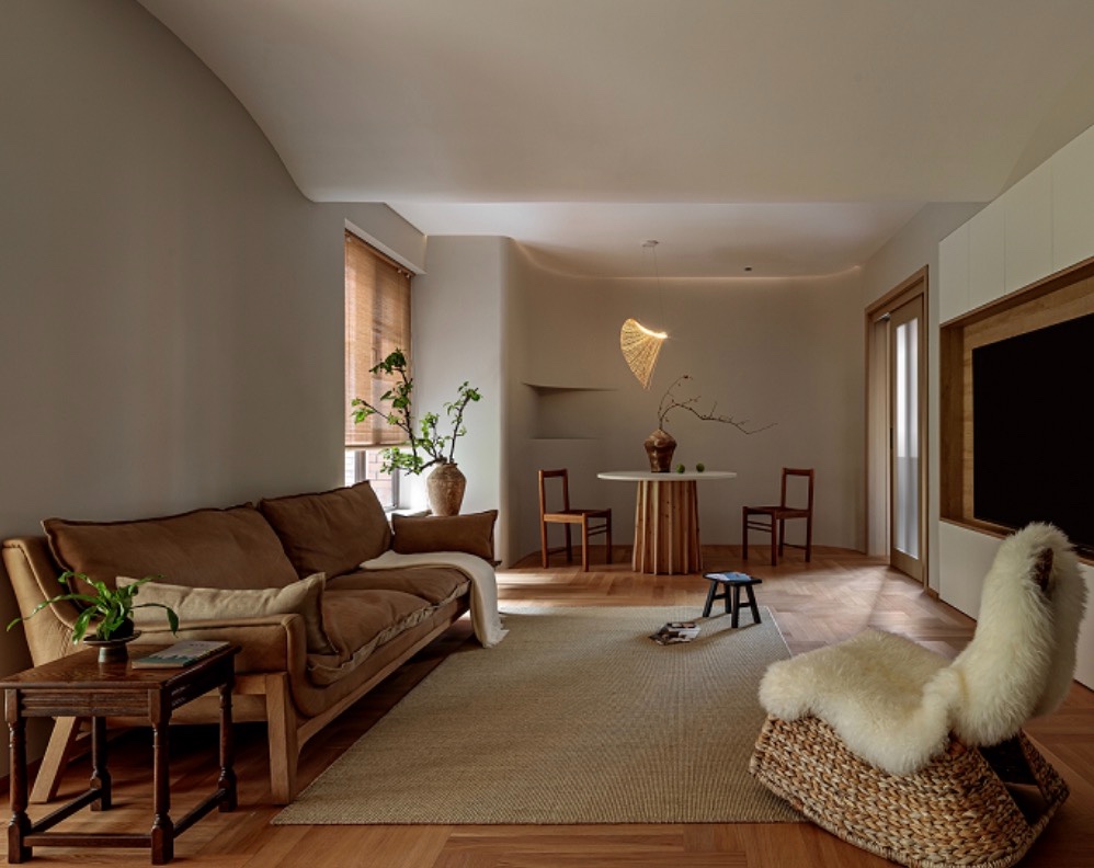 沙发顶部为一处承重梁,为四边形,菱角分明,呆板显压抑。利用劣势将其改为优势,创造一面优美的弧形构造。让空间在获得艺术张力的同时,变得立体、生动。