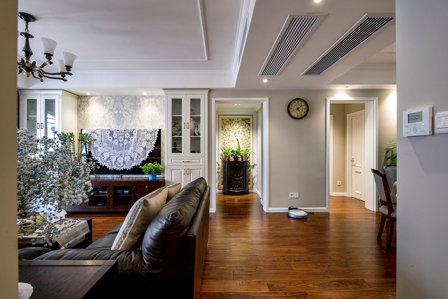 本案整体定位是温馨简美风,硬装没有过多的造型上的装饰。简洁的石膏线勾轮廓,精致的材质,配以木色美式家具。整个空间,以中性暖色为背景,适中暖色地板,衬托深色皮质沙发,沉稳不失温馨。