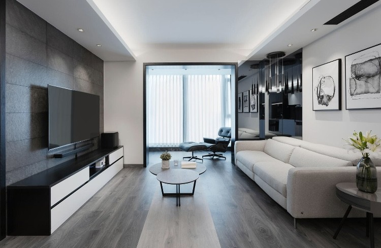 现代简约风格,经典的黑白灰加木色。白色现代柜体让空间干净明快,木色地板增加柔和的气质。客厅的地板延续到餐厨区,让空间更有扩张感。