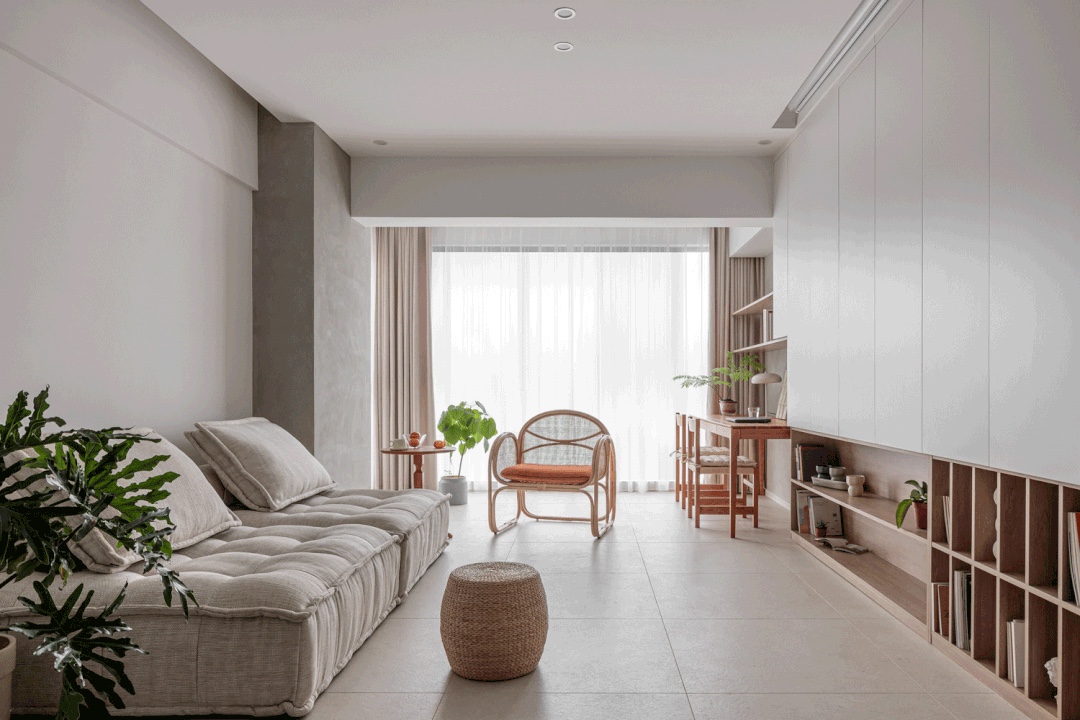 客厅地面的地砖直接铺通, 阳台的功能和客厅也合二为一。 屋主想要的阳光满满的书房, 在阳台上得到了实现