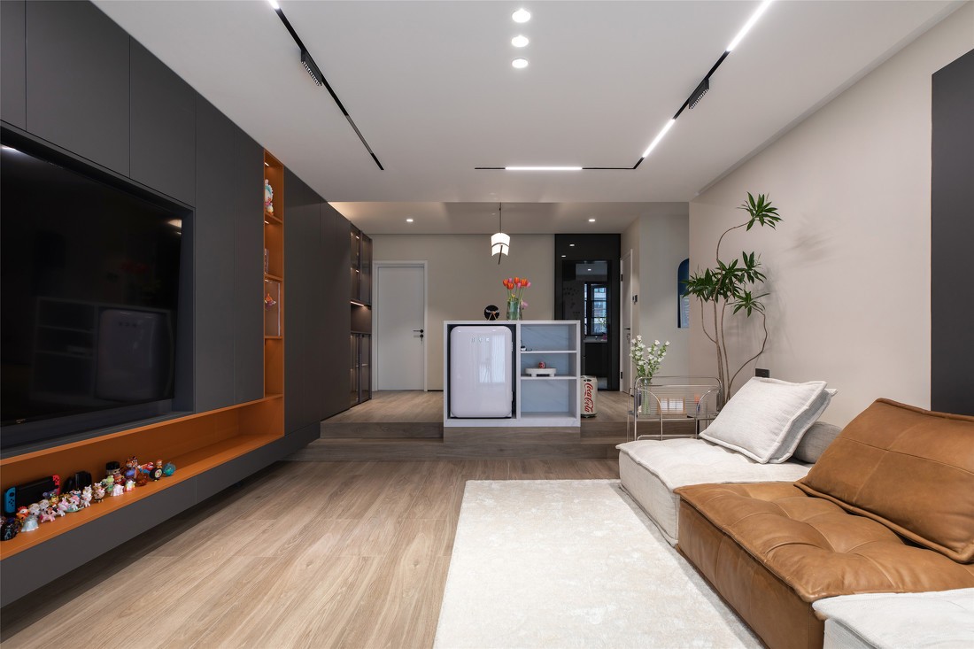 简洁的平顶设计,使得客厅层高开阔,充盈着清爽的呼吸干,几何磁吸轨道灯与防眩射灯看似不经意的组合,满足空间多场景的照明需求。