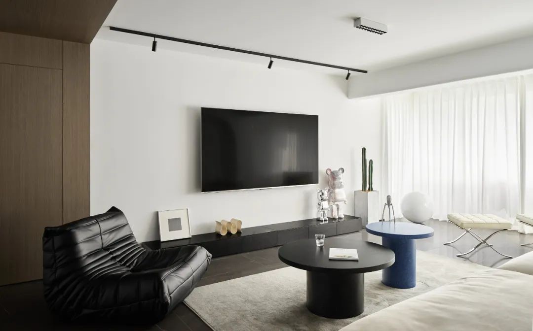 客厅以黑白灰搭配原木的底层逻辑贯穿整个空间,电视背景墙摒弃了所有不必要的修饰,***落地的黑色抽屉电视柜,满足部分收纳的同时,又为空间增添了几分潮酷。