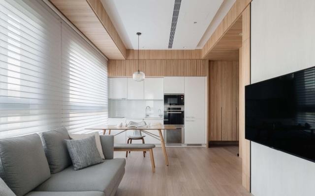因为空间不大,所以在设定时采用淡色木纹与浅色为空间主调,并实行减法原则,只作必要收纳,让空间回馈于更舒适地使用当中。