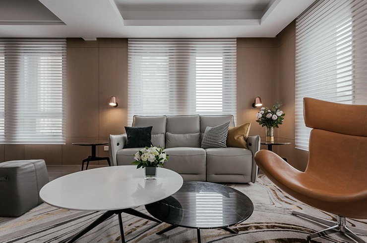客厅作为活动的公共区域,减少小件家具的数量,保持了一个简洁的空间环境。通过增大采光的面积将自然光引入室内,在材质上摈弃了厚重的遮光窗帘,而是使用白色的百叶片,轻盈感与明亮感呼之欲出。