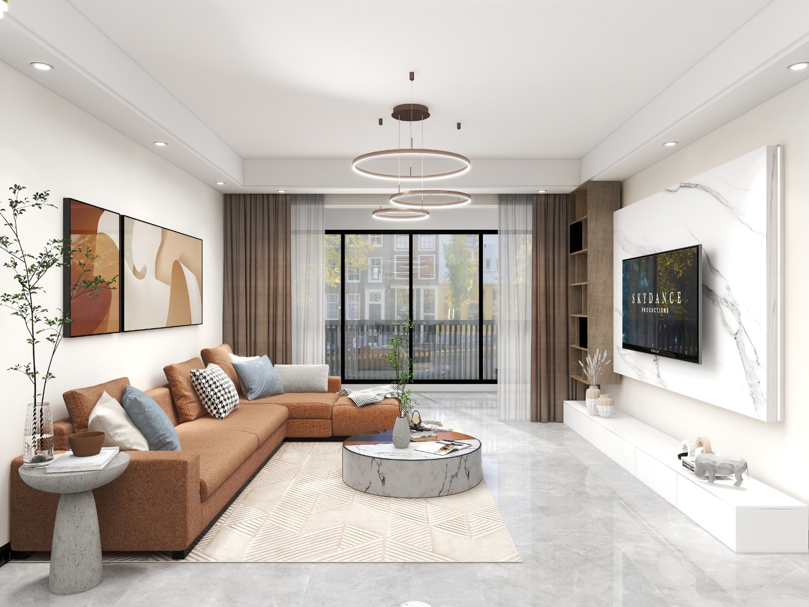 客厅设计暖黄色系的油漆,双眼皮吊顶简约现代,电视背景摒弃了满铺整面墙的设计,选择中间突出的这一种款式,既传统又时尚,温馨的家因为橙色的沙发更加灵动。