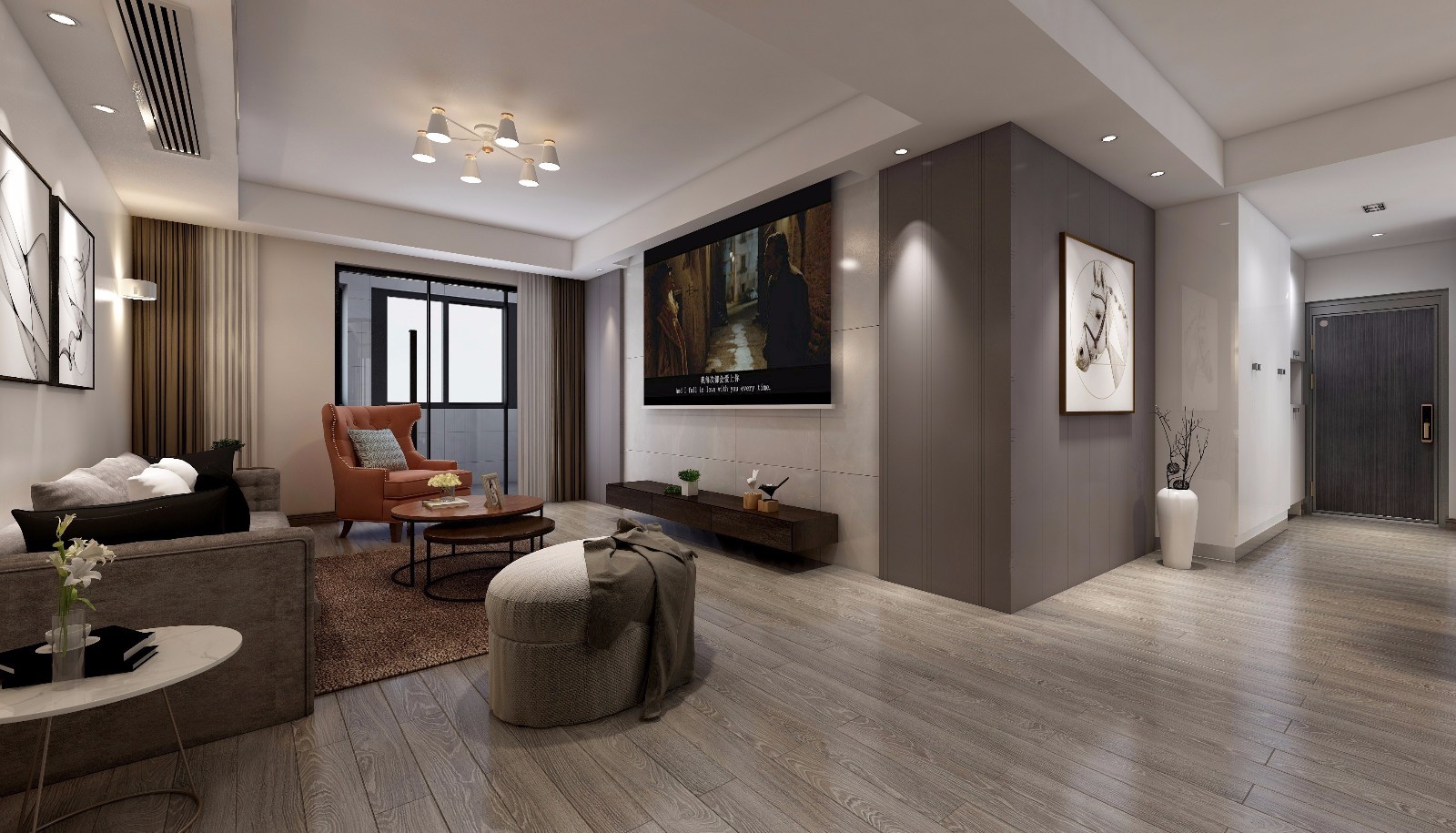 本案整体定位是现代简约风,硬装没有过多的造型上的装饰。中西厨的设计,满足现代年轻人精致生活需求。精致不失大气的材质,配以深色木质家具。整个空间,以干净白色为背景,灰色地板,局部灰色护墙装饰,透出高雅轻松空间氛围。