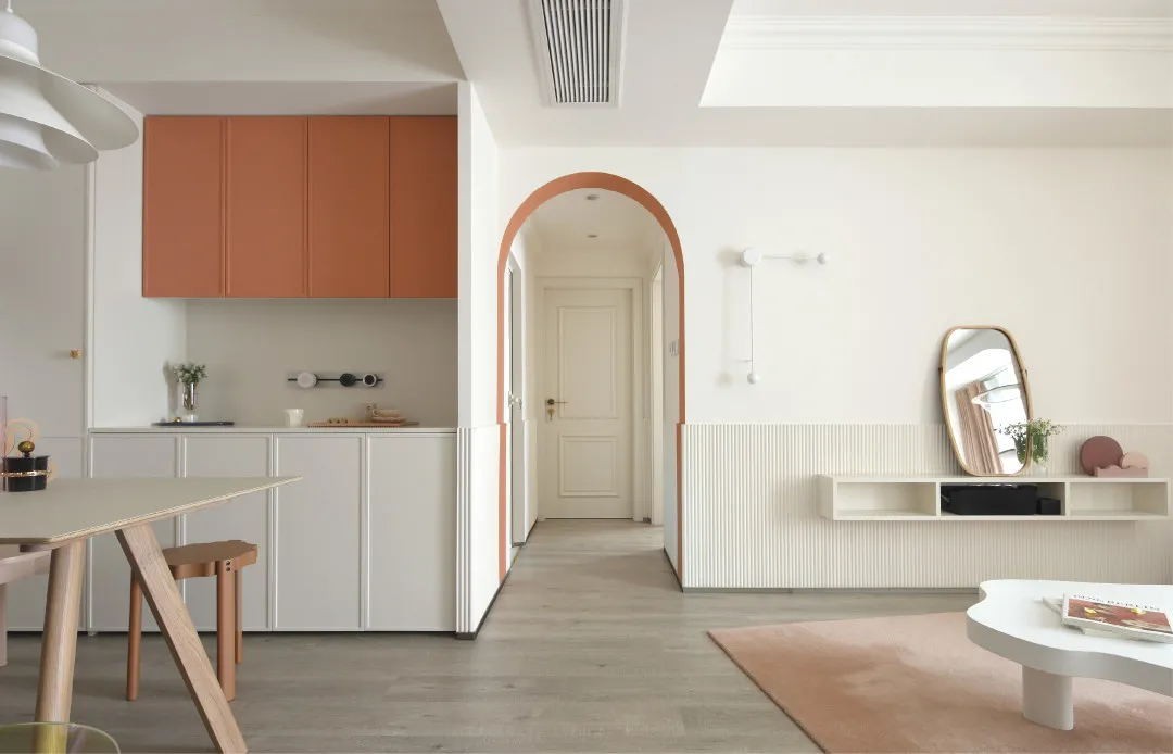 室内以白色和粉橘为主调色, 奶白色简洁大方又温柔, 粉橘色则为房子增添了鲜活与甜蜜。