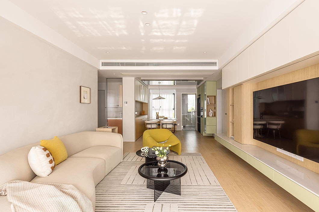 现代空间中大面积运用暖白与原木,搭配浅草绿,趣味黄色系,达到温馨且有格调的居家氛围。