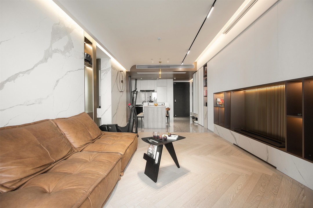 客厅,天花的磁吸轨道灯、木饰面电视柜,从餐厅拉满至客厅,瞬间构造出了大平层横厅的空间效果。