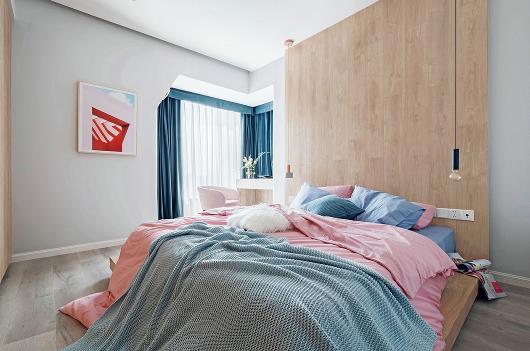 主卧区域的软装搭配上也跟着整体的蓝粉灰色调走,床单选择的是zara home,舒适感极强. 为避免显得呆板,在保证床单舒适度的前提下,设计师选择用同款不同色的面料进行拼接搭配的方式