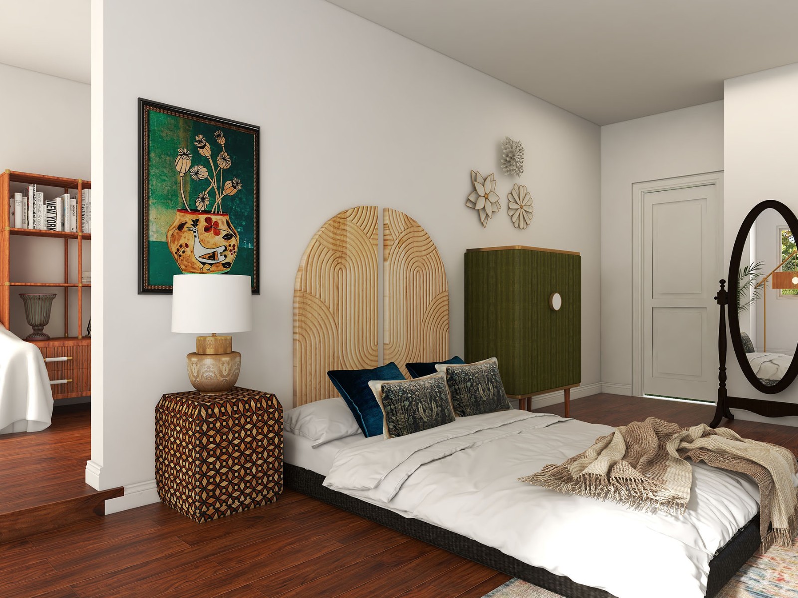 床头板是和床分离的波希风格的,***整体是现代波西米亚风格