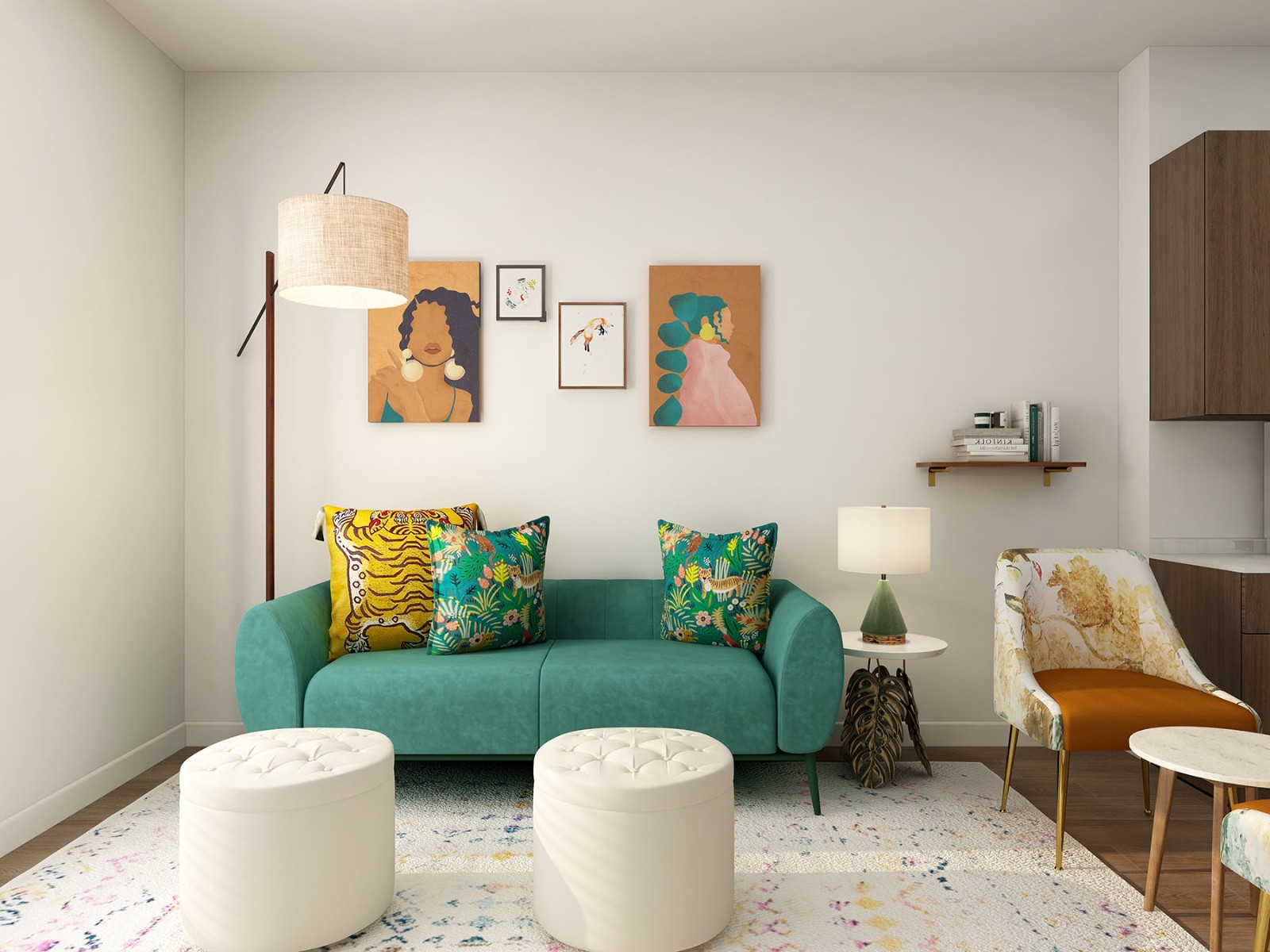 户型是个开放厨房+餐客厅的大开间,软装风格是中古风格