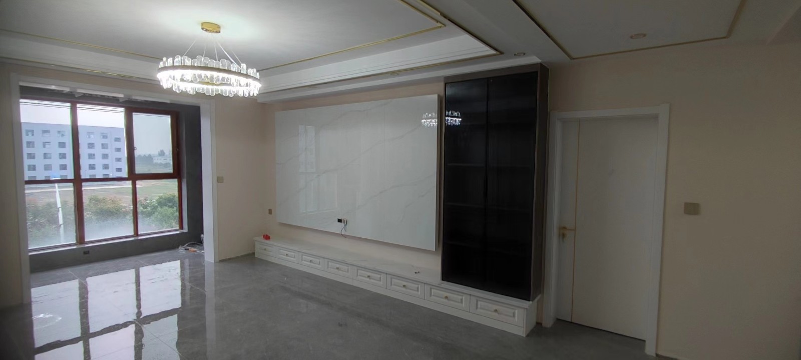 背景墙采用白色石材上墙的方法更显大气,一旁的黑色展示柜和白色的电视背景墙撞色让视觉上更显大气