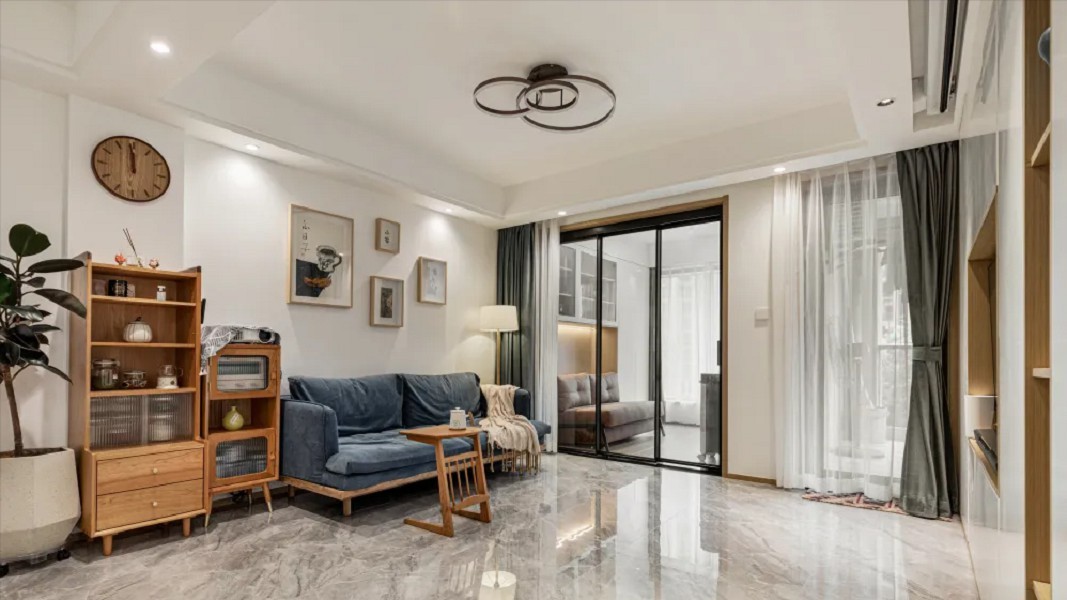客厅和阳台书房采用玻璃隔断,三联动玻璃门,大大引入自然采光,空间通透明亮。
