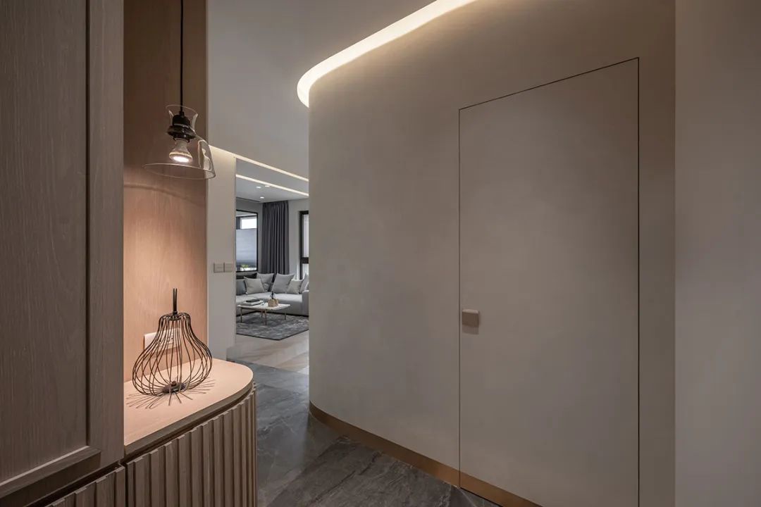 光点自透明钵盆散透而出点亮了圆弧平台让温润木色渲染家的温馨这座藏于门后的玄关柜收进钥匙鞋子还有定格回忆的相框伴着天花板和墙体抛出的弧线形构一条蜿蜒二进式路径