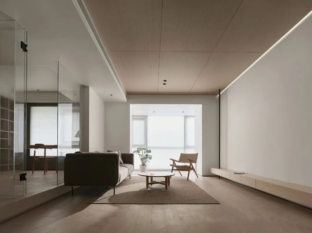 深色悬空餐边柜,方便收纳,原木餐桌上方奶白色造型灯精巧雅致
