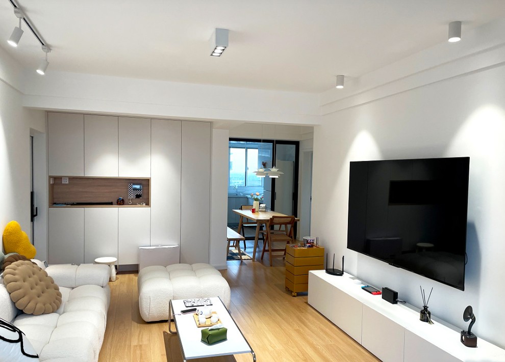 根据屋主的需求,电视背景墙只需要保持干净墙面即可,我们让沙发与电视机背景墙保持在水平的视觉线上,两部顶端用明装筒灯进行灯光装饰,让墙面更具动态感,用简约的设计呈现活泼的空间,客厅更显层次感。