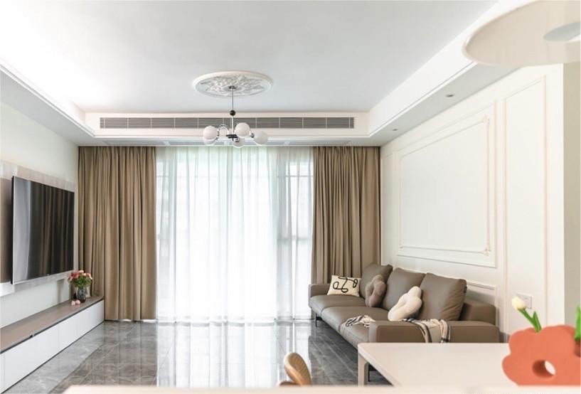 奶茶色系的客厅大气雅致 简单的石膏线条勾勒出精致的沙发背景墙 打造立体感 搭配雕花石膏灯盘复古又吸睛 尽显法式风情