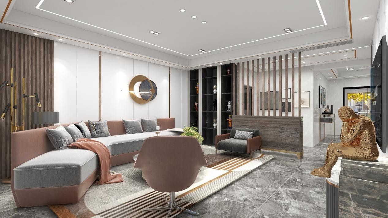 L型灰粉色沙发,与两个单人椅相对,使空间多了些交流感,同时单人椅与沙发的材质,颜色相搭配,色彩元素上体现了统一性。圆形层叠壁灯和金属线条简约时尚,装饰感很强。