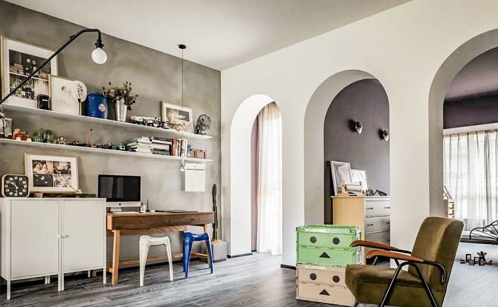 连续拱形门作为功能区的分隔过渡,借用儿童房的采光优势改善客厅。