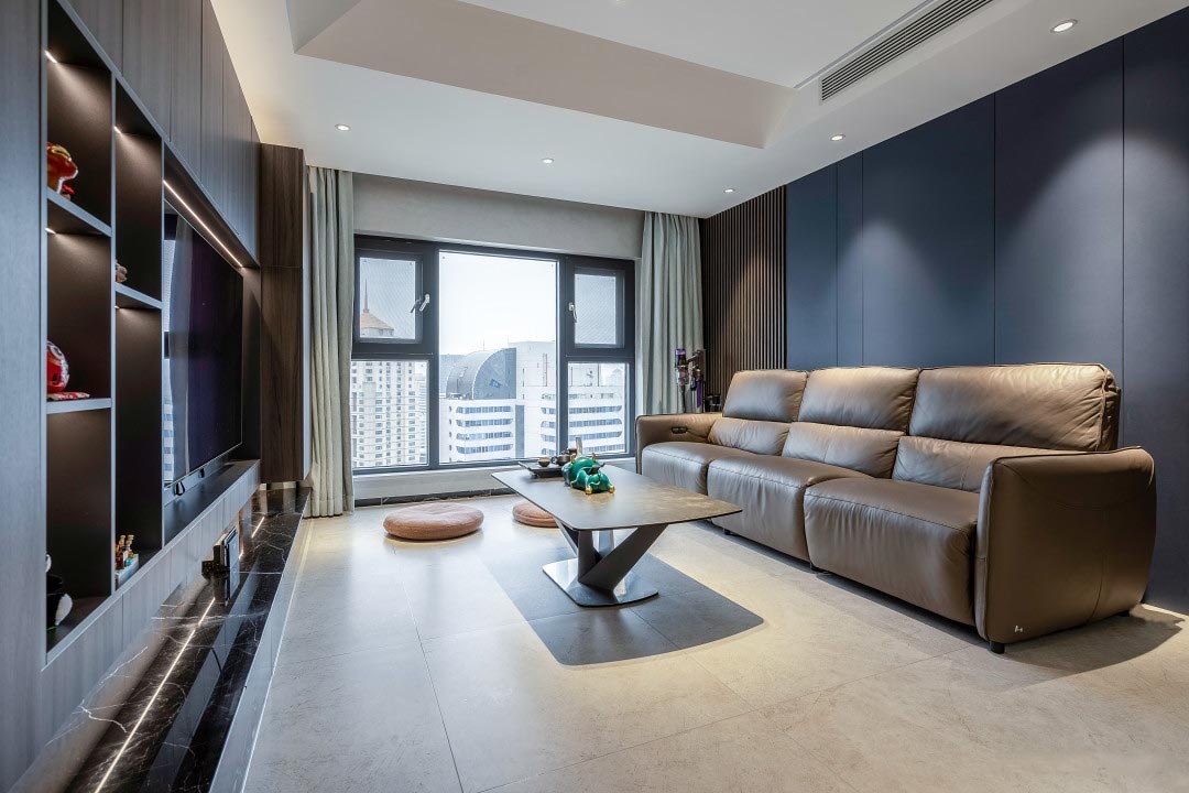 将阳台纳入后,才有了现在一望到底的竖厅格局,不管是景还是光,全都毫无保留收入其中。深色背景和浅色顶面地面,空间张驰有度。越深的底色便有越强的对比度,深色作为沙发和电视背景,人在其中被衬托得格外耀眼。