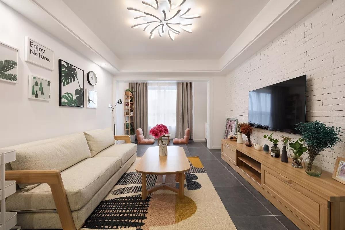 客厅电视墙以白色文化砖打造,木色电视柜上摆一排的绿植,在壁挂电视机的组合下,显得简洁文艺而又清新;沙发墙上挂上一组清新的绿植装饰画,搭配上实木框架的布艺沙发,整体显得舒适而又惬意。