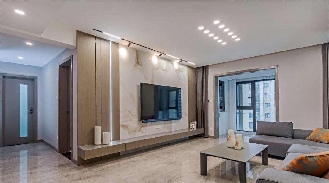 客厅用了许多木质墙板,墙板本身是工厂定制的实木清水漆墙板,虽然也要诸多贴片类墙板纹理感不错,但考虑环保问题还是选用的实木做油漆 由于业主家有亲戚做瓷砖,所以墙砖方面也是强烈推荐了她们家亲戚的这款大板砖,整体与风格相对也不违和 墙面是选择的高精密浅灰色墙布,日常也比较好好打理,控制住色彩的种类和范围,而且使房屋的视觉上与“静”这个观点相连接