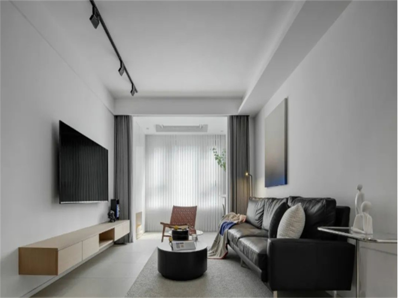 纯白色沙发背景墙,黑色沙发,简洁挂画流露墙面层次,让空间充满意境