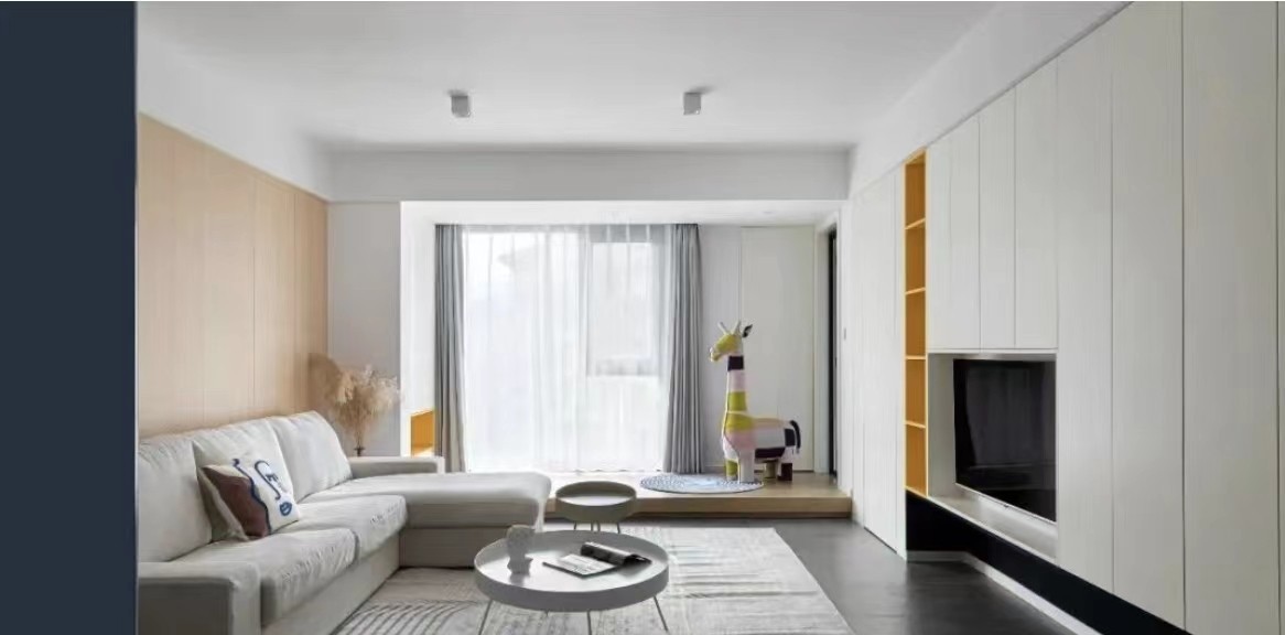 白色墙柜仿佛一面大白墙,简洁大方。中部明黄色开放格可作为***的陈列台,提升了空间层次,总体效果惊艳