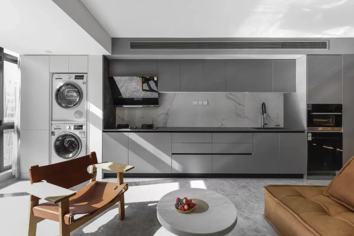 客厅阳台、开放式厨房、通往卧室的隐形门、冰箱四周柜体都使用了灰色,视觉上更有整体感。