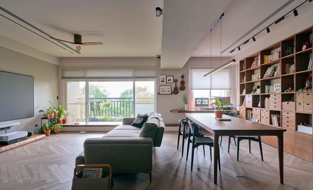 客厅与阅读工作区间,有一式大型低樑贯穿 内隐吊隐式冷气、除湿机、全热交换机 因此,不降低天花包覆,刻意涂覆手工漆突显存在感 反倒转化低樑为端景主题,形塑明确分野