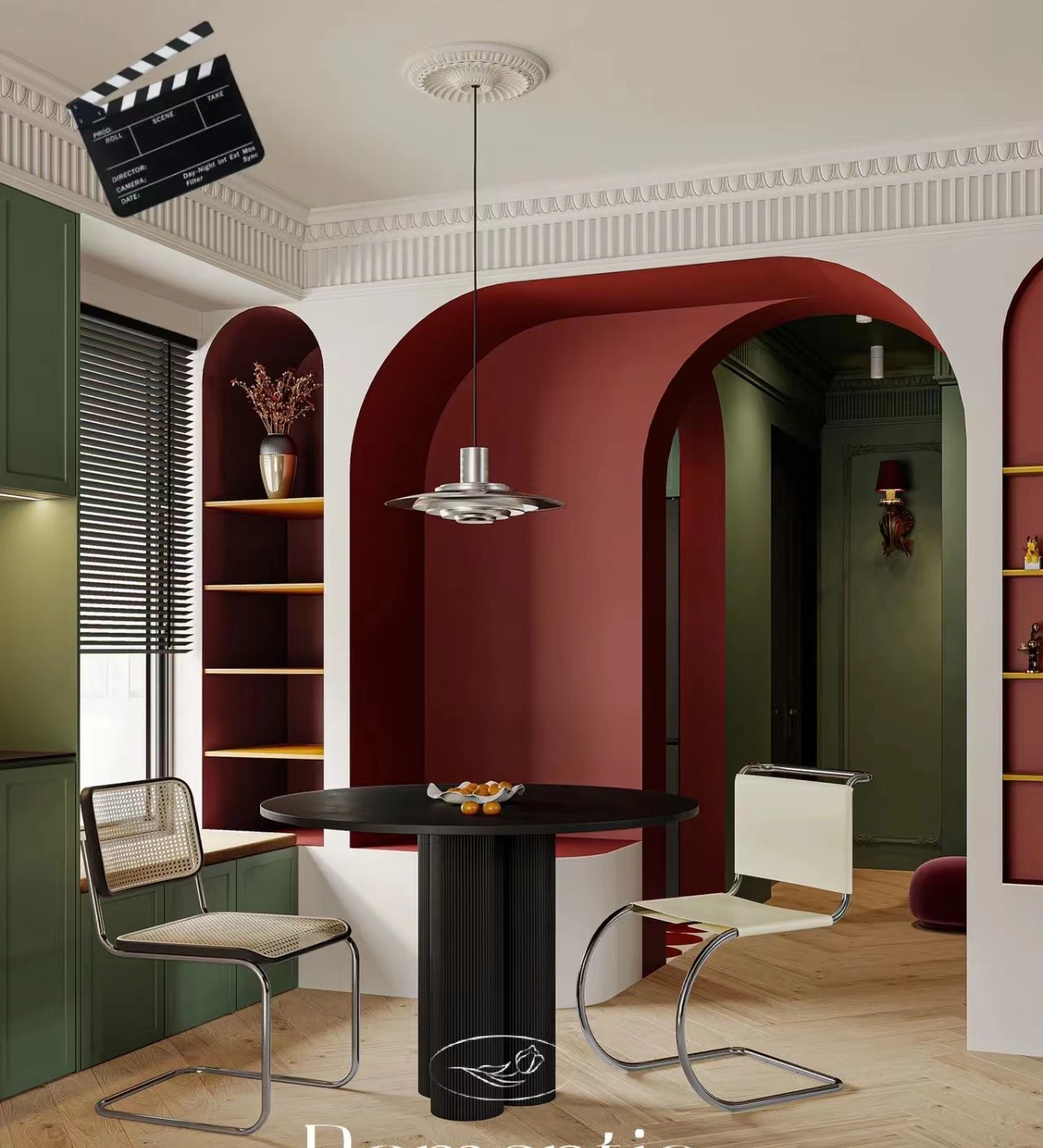 女主喜欢浓郁的法式感,深化设计采用复古色 红 绿 焦糖色为整体基调