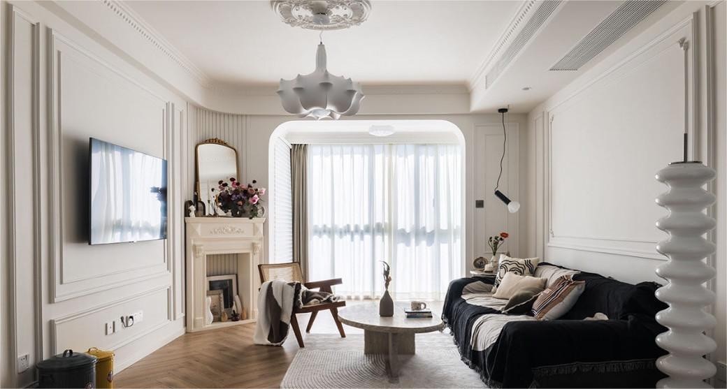 在保证承重的情况下,打掉阳台两侧多余砖墙,让客厅与阳台之间的门洞尽可能扩大,***限度的引入阳光。然后用利用石膏板将门洞做成圆弧形,并与客厅左侧墙角处的壁炉相连,这空间的转换变得自然流畅