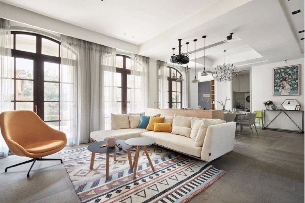 客厅是非常休闲的搭配,米色沙发配上几个暖色抱枕再搭配几何图案的多彩抱枕,真的特别温馨