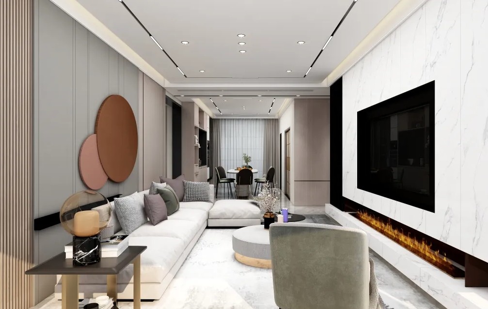 悬浮岩板电视背景墙,硬包沙发背景墙,无主灯磁吸灯吊顶